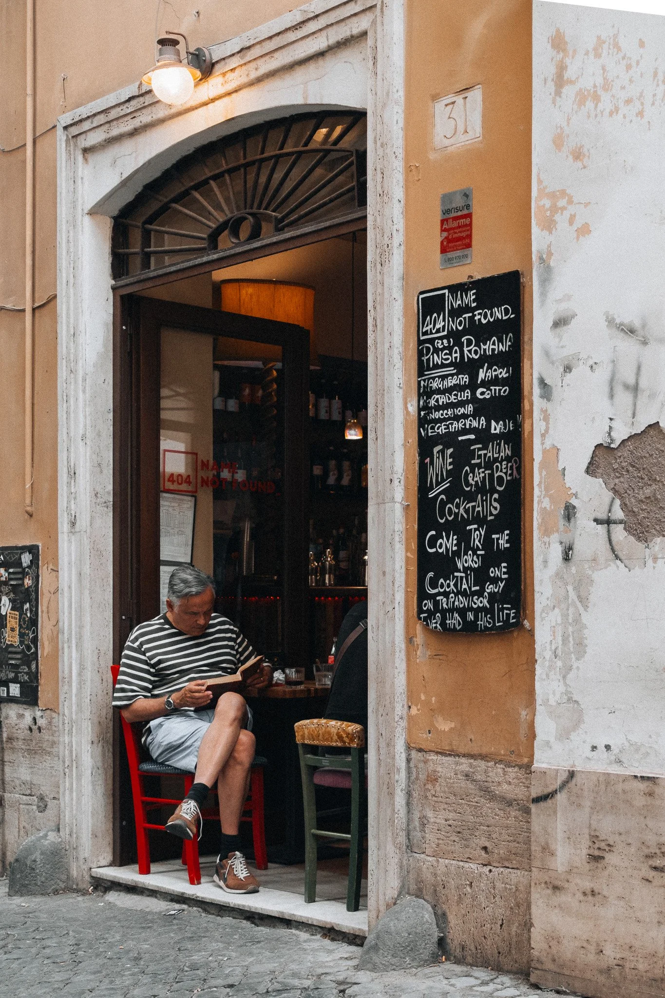 A man reading a menu outside a small restaurant or cafe with an open door and a blackboard menu listing food and drink options in Italian and English.