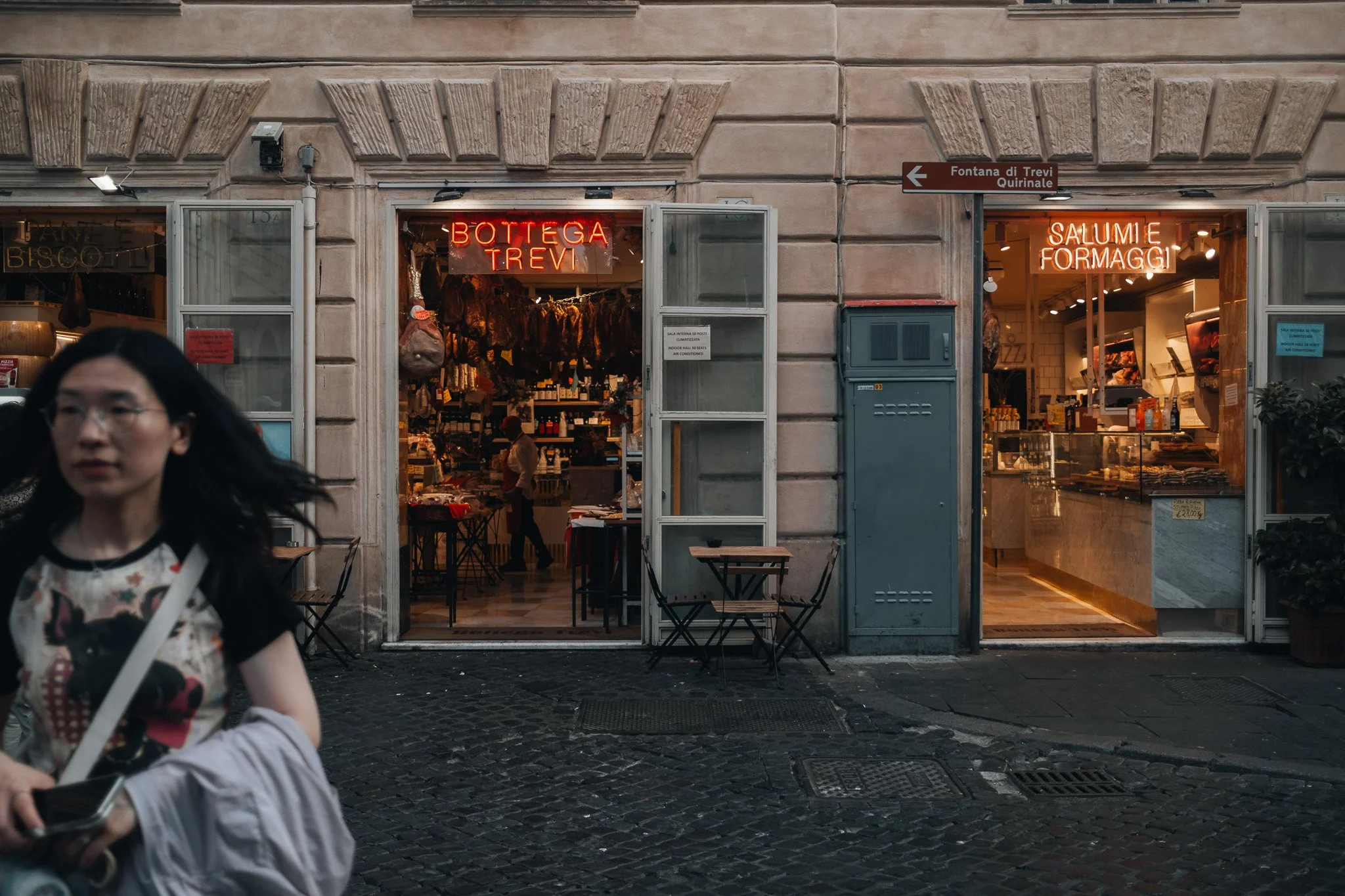 Street view of two open storefronts, one selling meats with hanging products and a neon sign reading 'Bottega Trevi' and the other selling salami and cheese with a neon sign reading 'Salumi e Formaggi'; a woman with glasses walking past in the foregr