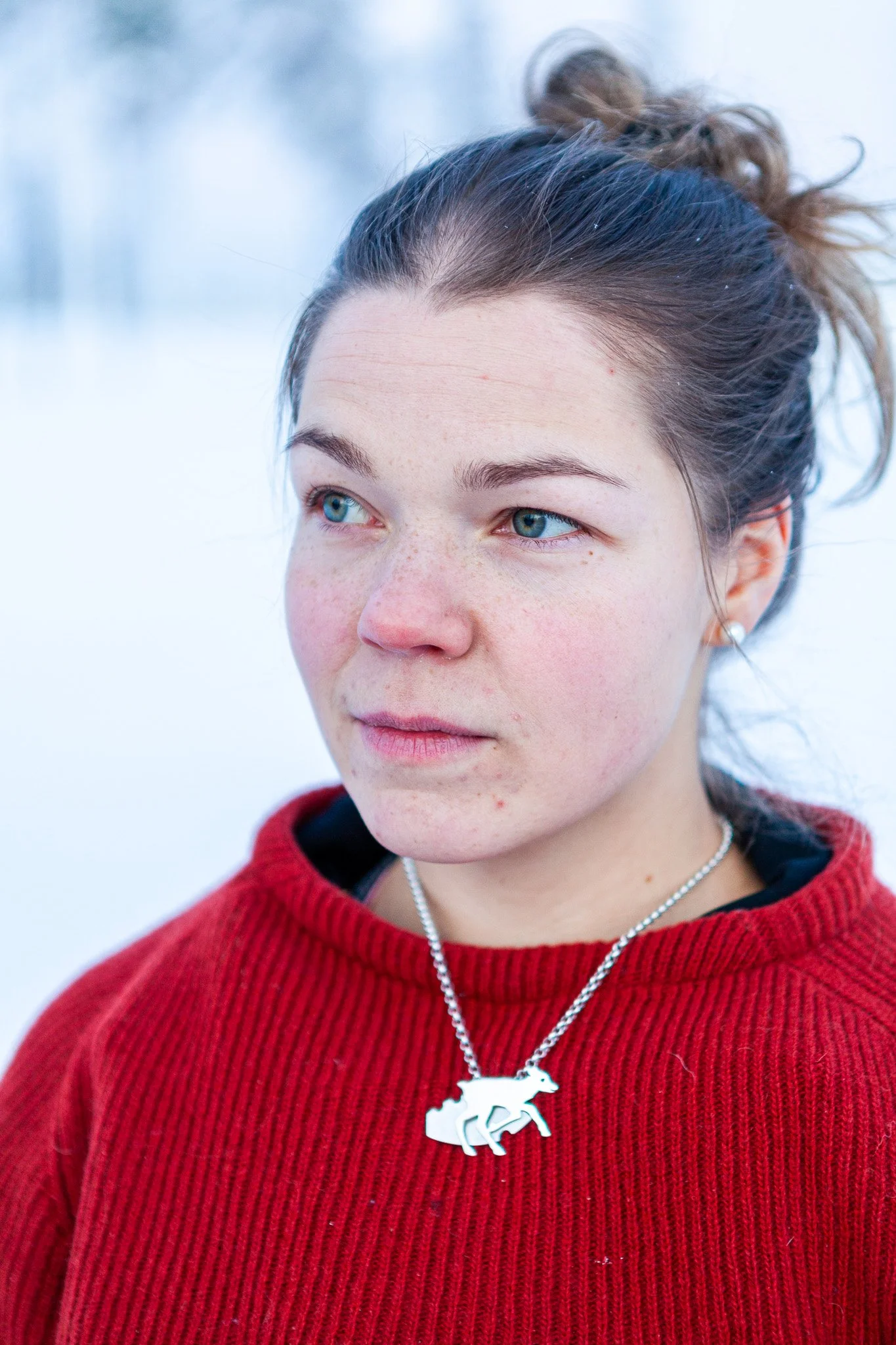 A young woman with light skin, short brown hair in a bun, and blue eyes, wearing a red sweater and a silver necklace with a wolf pendant, outdoors in a snow-covered area.