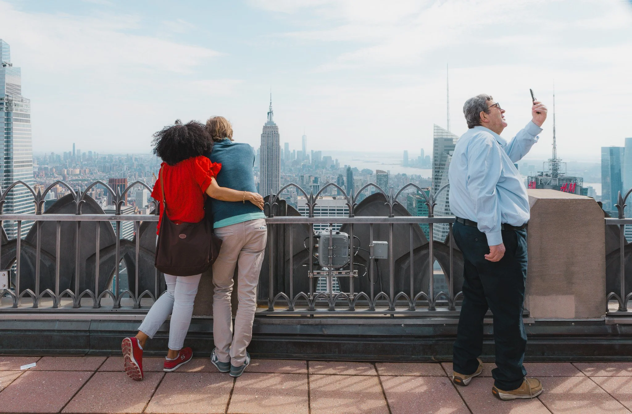 Two women embrace while looking out over the New York City skyline from a skyscraper observation deck, with an older man taking a selfie nearby.